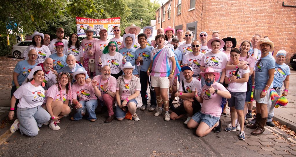 This year’s Manchester Pride Parade’s overall theme was LOVE, so Prairie Dogs were very excited to showcase our entry demonstrating our love and support for the Trans and Non-Binary communities. It was one of our biggest ever entries with 50 participants, headed up fabulously by Elliott – he and the troupe did us Proud!